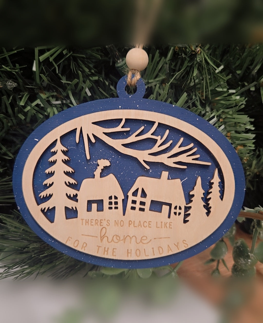 Bring a touch of nostalgia to your Christmas tree with this charming wooden ornament. Featuring a cozy winter village scene under snow-dusted pine branches, it’s engraved with the heartwarming phrase “There’s No Place Like Home for the Holidays.”